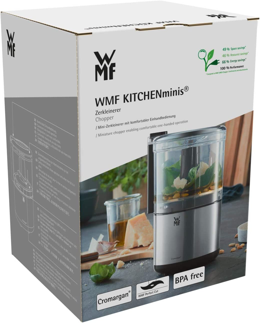 آسیاب KITCHENminis وی ام اف با بهره گیری از فناوری انحصاری Perfect Cut ساخته شده و یک وسیله عالی برای خرد و آسیاب کردن انواع مغزها، ادویه ها، سبزی ها و حتی شکلات و پنیر است. این آسیاب کاربردی از جنس استیل مات Cromargan® ساخته شده و دارای کیفیت و دوام بسیار بالایی است. تیغه های تیز و قدرتمند آسیاب هرگونه مواد غذایی را سریع و یکدست برای شما آسیاب می کنند. برای سهولت در شستشو، قطعات دستگاه از هم جدا شده و قابل شستشو در ماشین ظرفشویی می باشند. این آسیاب کوچک بگونه ای طراحی شده که کار کردن با آن بسیار آسان است. این دستگاه همچنین دارای مکانیزم ایمنی پیشرفته می باشد و با توجه به اندازه کوچکی که دارد، جای کمی را در آشپزخانه می گیرد.