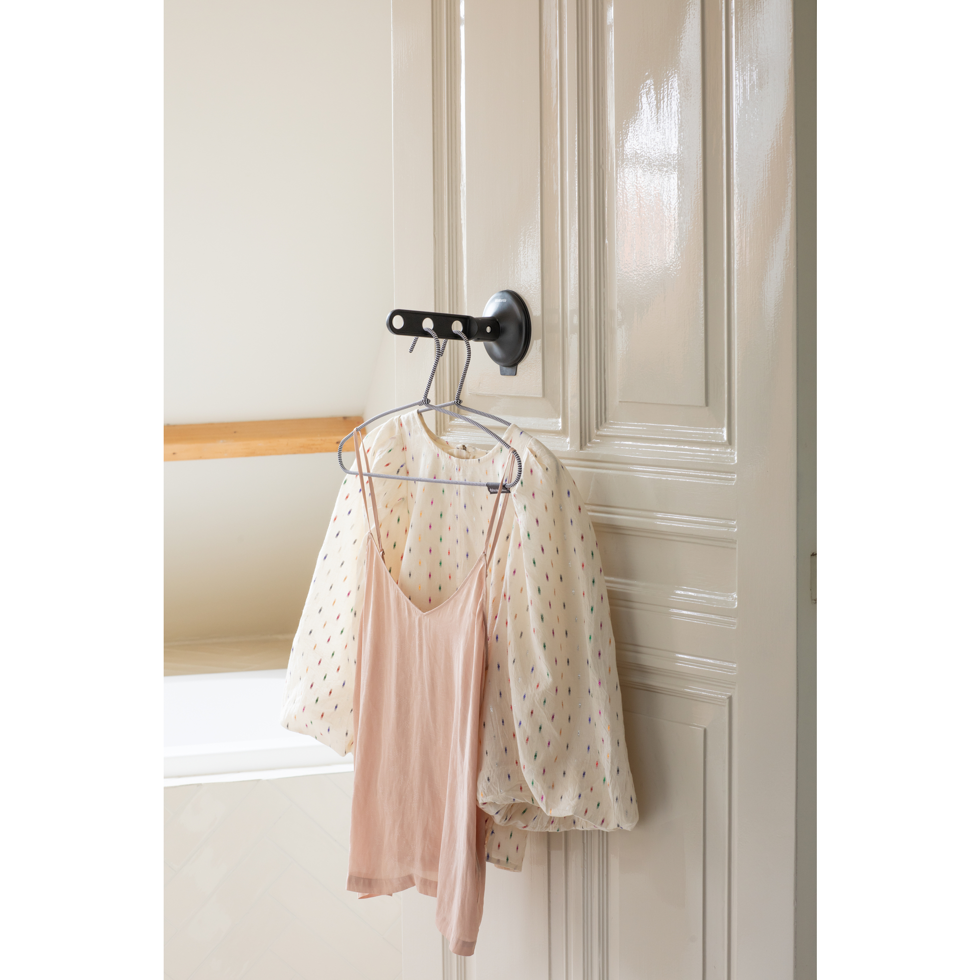 هواگیری لباس‌ها باعث صرفه‌جویی در شستشو می‌شود. با قلاب لباس Brabantia با مکنده می‌توانید لباس‌های خود را هر کجا که دوست دارید آویزان کنید. این قلاب هوشمند می‌تواند 3 آویز و تا 2 کیلوگرم وزن را تحمل کند. فقط آن را به یک پنجره باز، درب دوش یا کاشی‌ها بچسبانید تا هواگیری شود.
