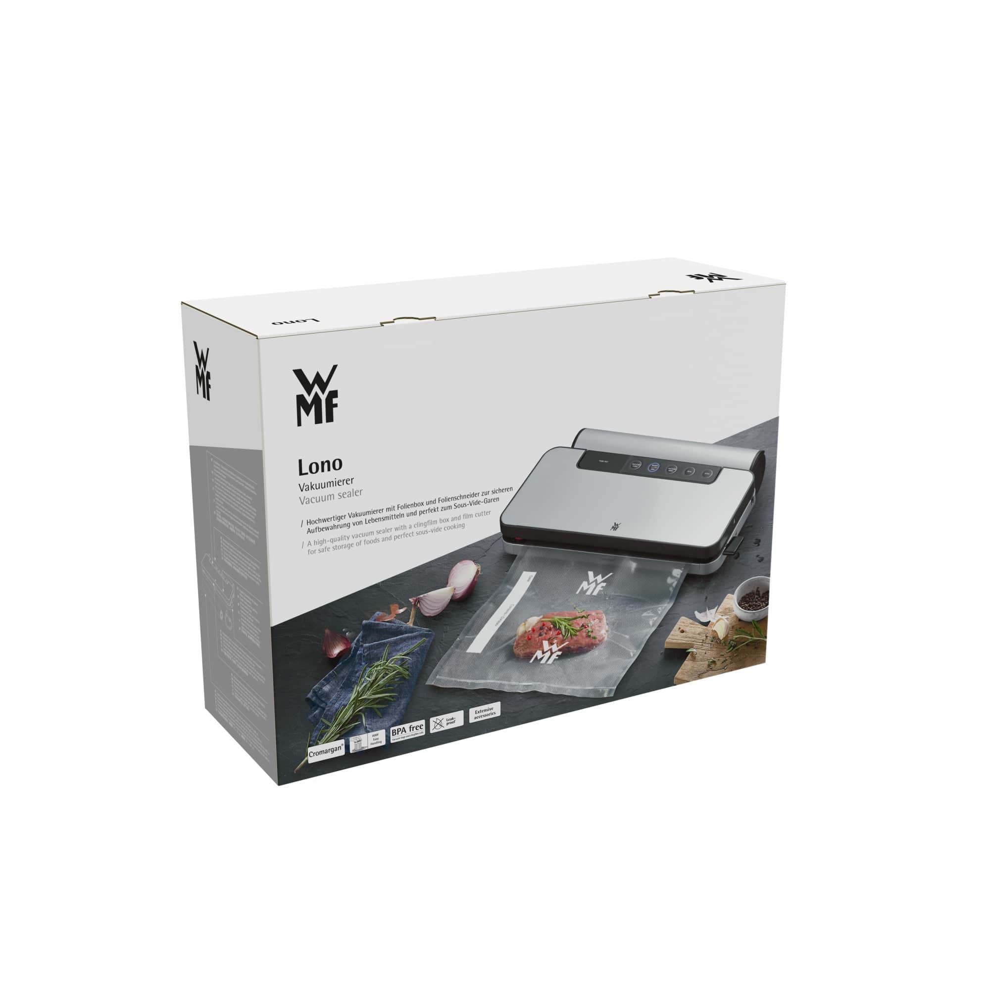 بسته بندی وکیوم Lono وی ام اف یک وسیله کاربردی برای بسته بندی انواع مواد غذایی می باشد. به کمک این دستگاه شما می توانید مواد غذایی را برای مدت بیشتری تازه نگه دارید. این دستگاه وکیوم قدرتمند می تواند تا 12 لیتر مواد را هر در دقیقه هواگیری کند و شامل یک رول پلاستیک مخصوص هواگیری (30 در 150 سانتیمتر) و 5 کیسه از قبل بریده شده (20 در 30 سانتیمتر) می شود. محفظه نگهداری رول قابلیت جدا شدن از دستگاه را دارد و شما می توانید رول های تمام شده را براحتی تعویض کنید. بسته بندی وکیوم Lono وی ام اف دارای 5 سطح از تنظیمات می باشد و شما می توانید با توجه به تر یا خشک بودن مواد، هواگیری دستی یا اتوماتیک، و یا هواگیری مجزا، تنظیمات مورد نیاز خود را انتخاب کنید.