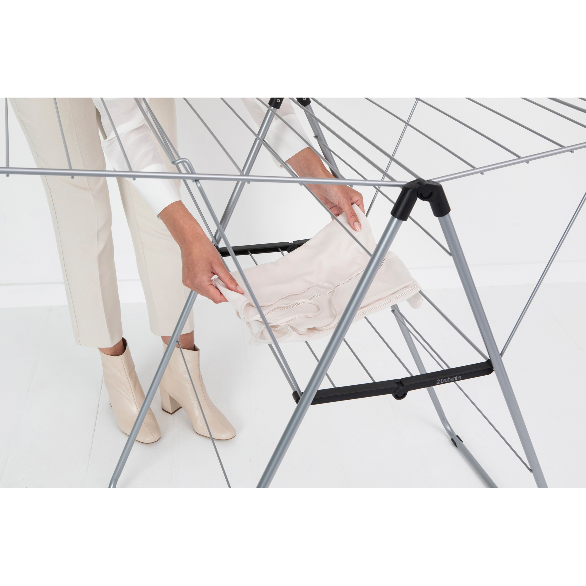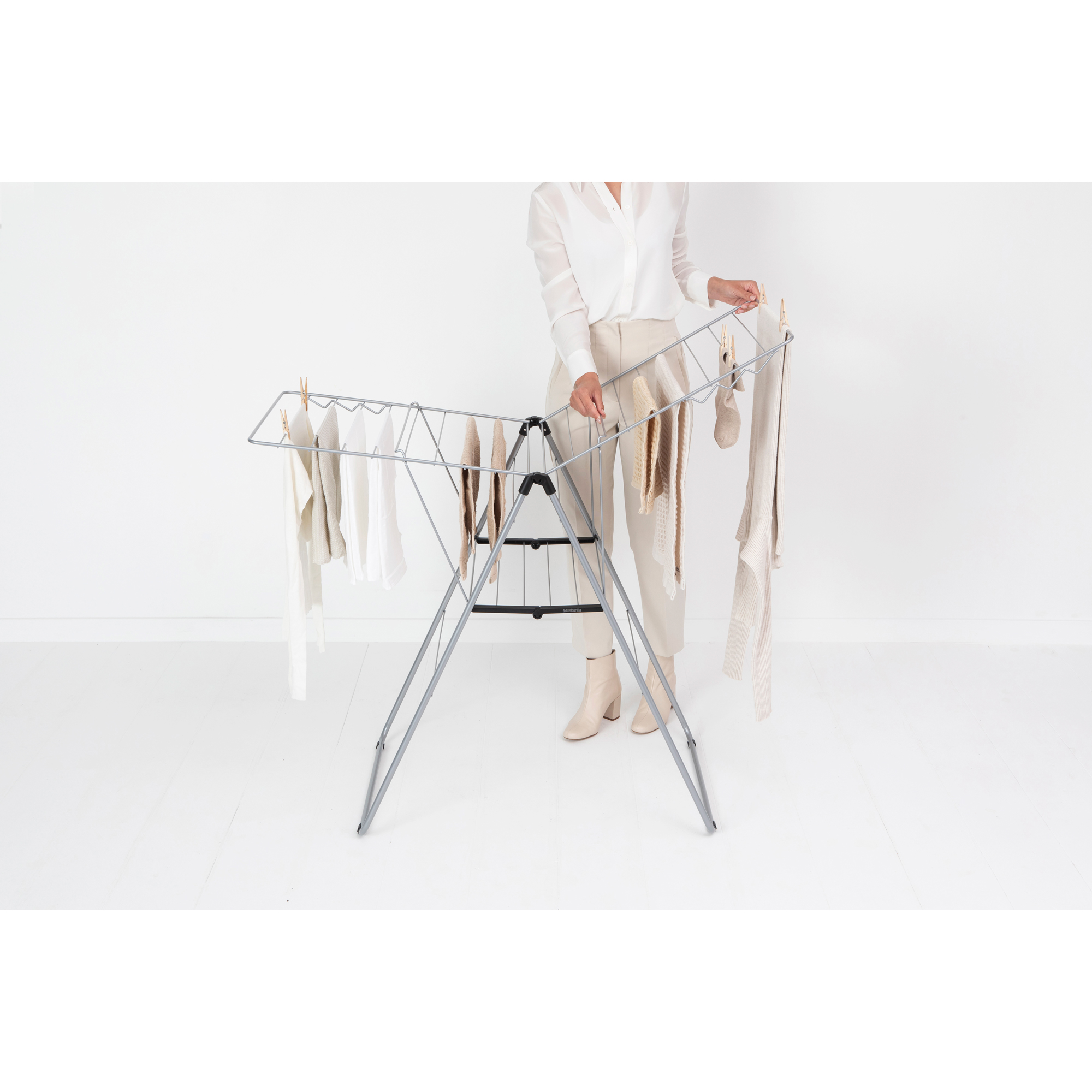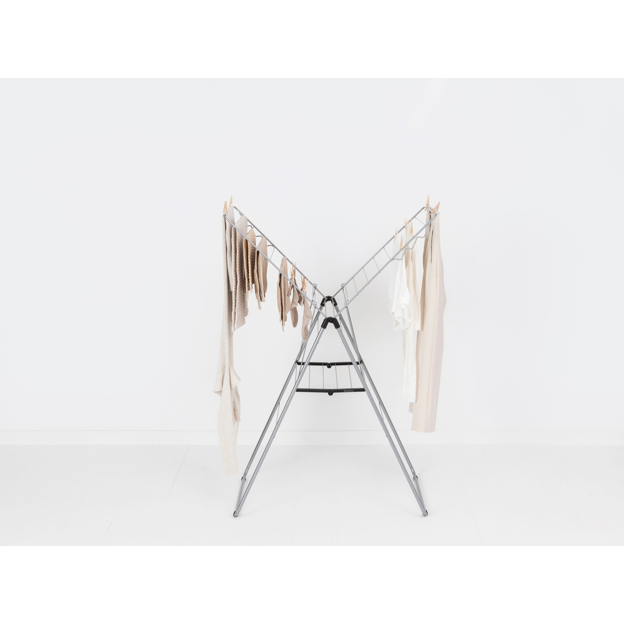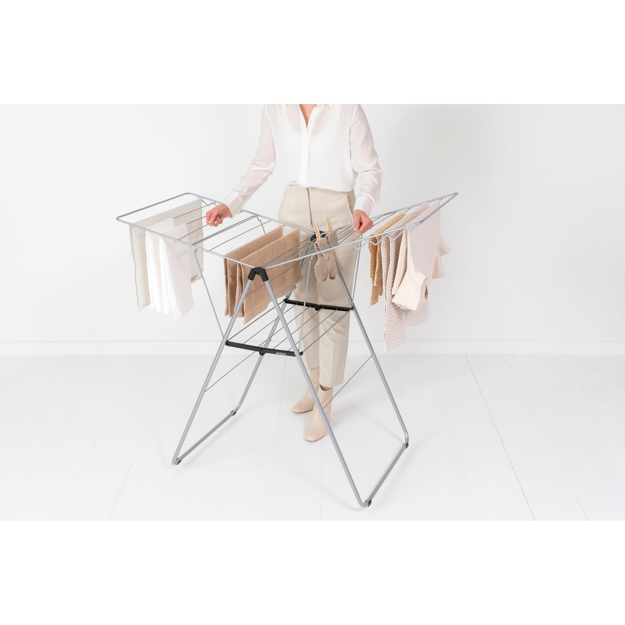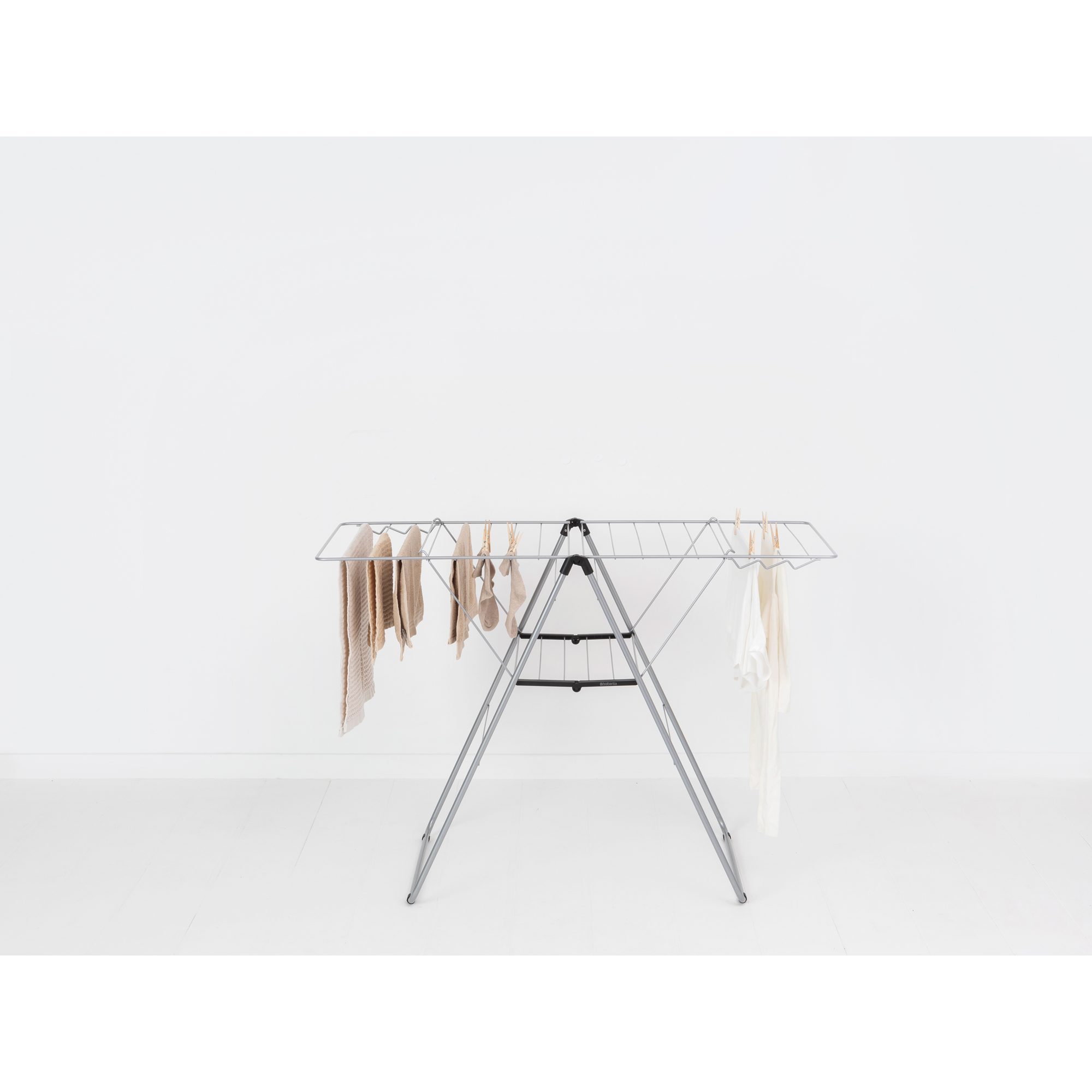 با بند رخت 20 متری خاکستری متالیک برابانتیا در انرژی و زمان صرفه جویی کرده و لباس هایتان را بصورت طبیعی خشک کنید. با 20 متر فضای قابل تنظیم برای آویزان کردن لباس ها و یک فضای مخصوص برای آویزان کردن 6 چوب رختی، شما می توانید حتی لباس های حساس خود را در هر نقطه از خانه که می خواهید خشک کنید. بند رخت 20 متری خاکستری متالیک برابانتیا انعطاف پذیری بالایی داشته و بسیار جمع و جور می باشد. شما می-توانید پس از استفاده براحتی آن را تا کرده و جمع کنید.