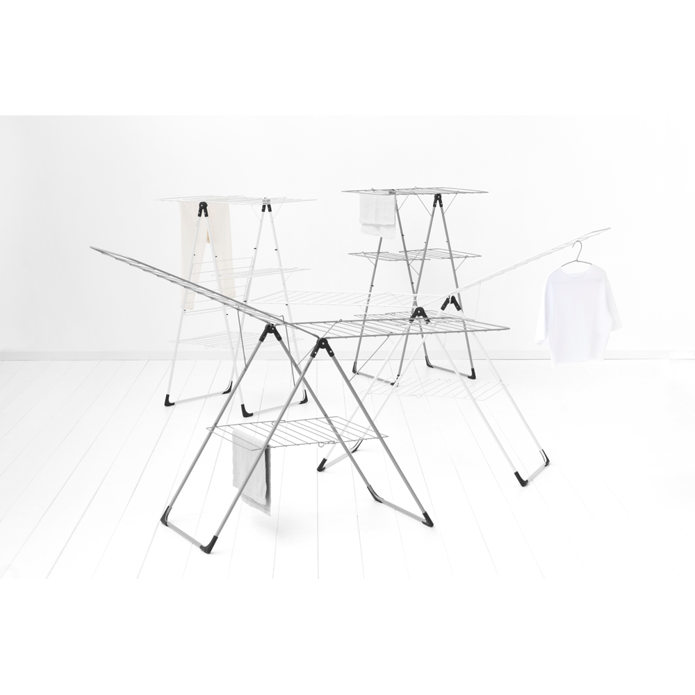 این بند رخت مدل T به راحتی می تواند به اندازه ظرفیت دو ماشین لباسشویی را روی دو بال خود نگه دارد که این شامل شلوار هم می شود. این بند رخت 20 متری سفید برابانتیا با داشتن قفل منحصر بفرد برای جابجایی، این امکان را به شما می دهد آن را بدون اینکه از هم باز شود جابجا کنید. در زیر آن سکویی وجود دارد که می توان اقلام شسته شده رو صاف روی آن قرار داد تا خشک شوند. بعد از اتمام کار به راحتی آن را تا کنید و در گوشه ای قرار دهید.
