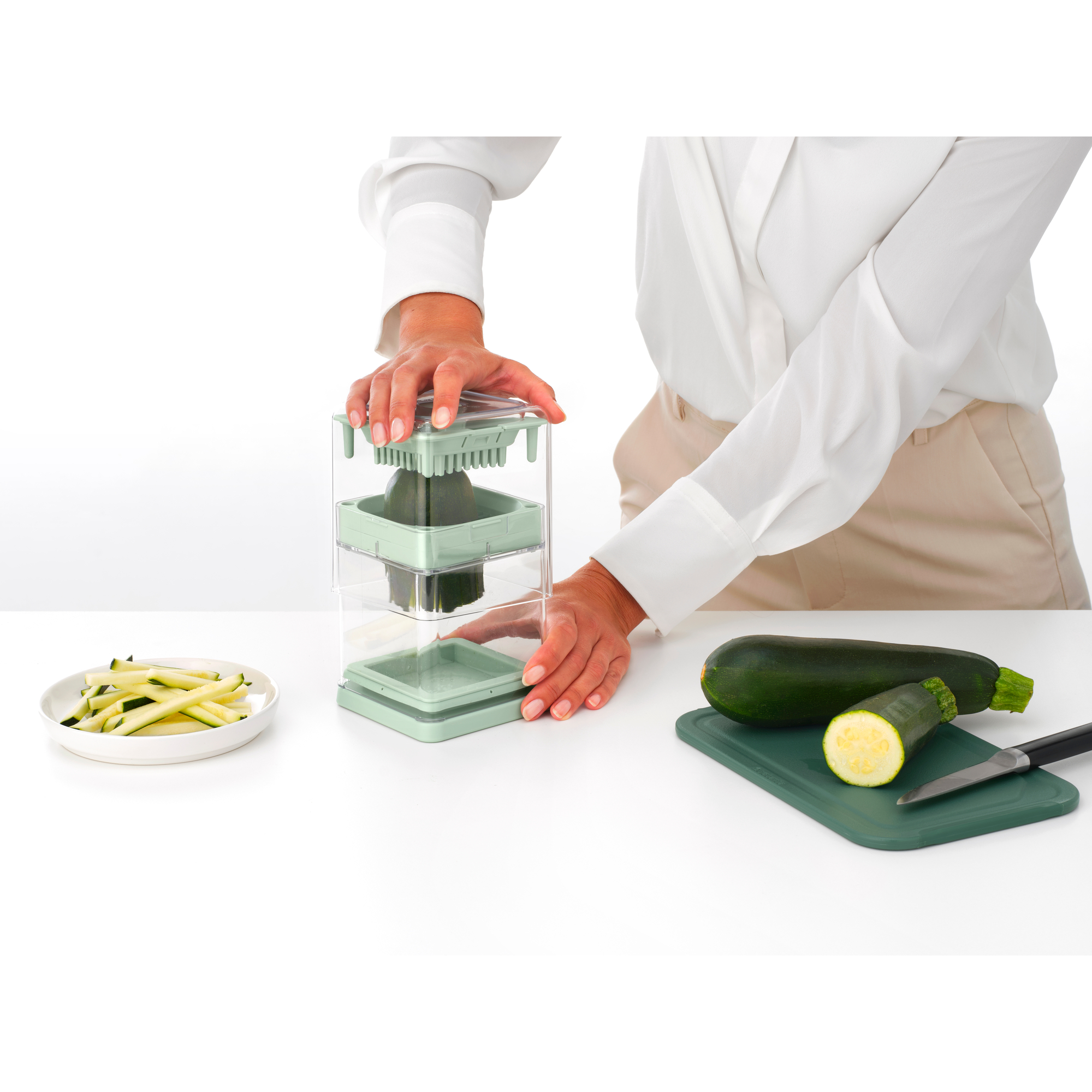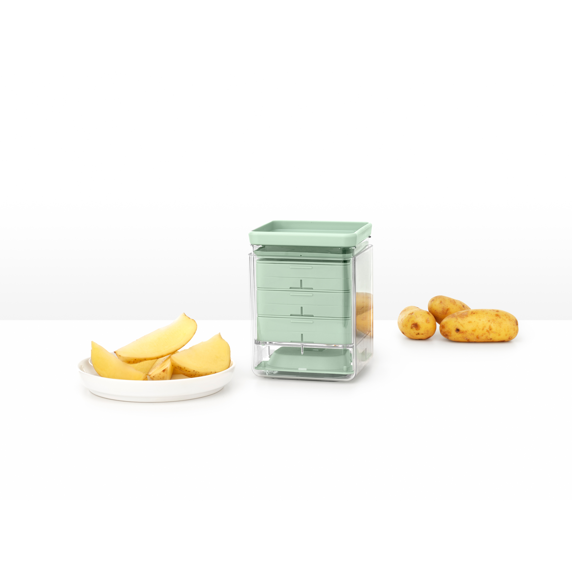 با خلالهای ناهموار خداحافظی کنید و سیبزمینی، کدو، خیار و موارد دیگر را با برشهای بینقص برش دهید. برشدهنده سیبزمینی Brabantia Tasty+ یک جعبه جادویی با تیغههایی برای خلال کردن در دو اندازه است. کافی است تیغه مورد نظر خود را نصب کنید و سیبزمینی یا سبزیجات خود را روی آن قرار دهید.