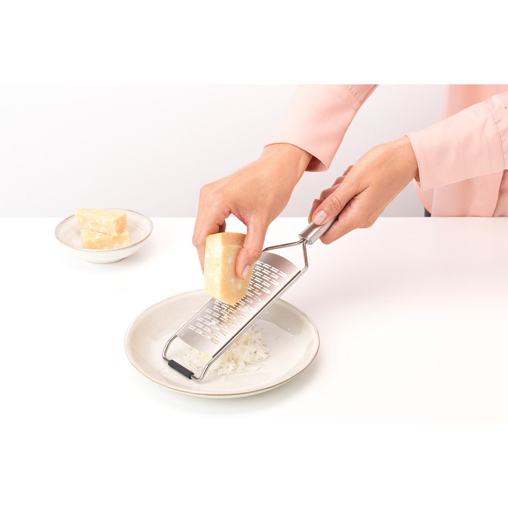 این رنده ریز پروفایل برابانتیا برای رنده کردن پارمزان، خیار، هویج و سایر مواد اولیه ایده آل است. حتی میتوانید با استفاده از این رنده تکه های شکلاتی درست کنید و از آن در درست کردن دسر مورد علاقه تان استفاده کنید. پایه ضد لغزش و صفحه بزرگ آن به شما کمک می کند تا به آرامی رنده کنید و غذا، سالاد و دسری که دوست دارید را با تکه های رنده شده درست کنید. در نهایت پس از استفاده به دلیل داشتن یک پوشش محافظ می توانید آن را در داخل کشوی آشپزخانه بصورت ایمن نگهداری کنید.