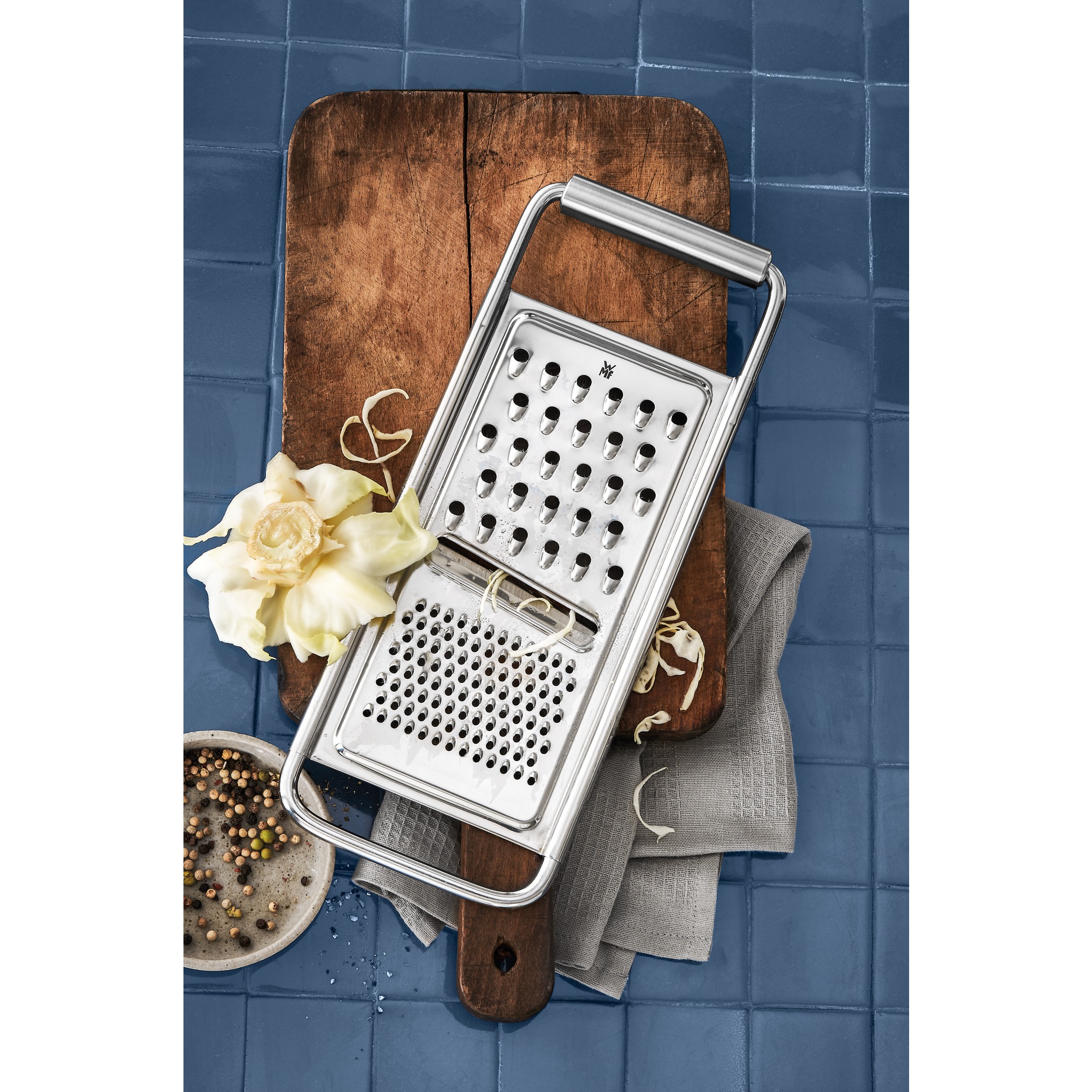 رنده چندكاره وی ام اف از استیل 18/10 ضد زنگ Cromargan® ساخته شده و دارای دسته لوله ای محکمی می باشد. استیل ضد زنگ باعث می شود این رنده بسیار بادوام و محکم باشد. همچنین طعم و عطر مواد غذایی را تغییر نمی دهد و می توان براحتی آن را تمیز کرد. این رنده قابل شستشو در ماشین ظرفشویی می باشد.