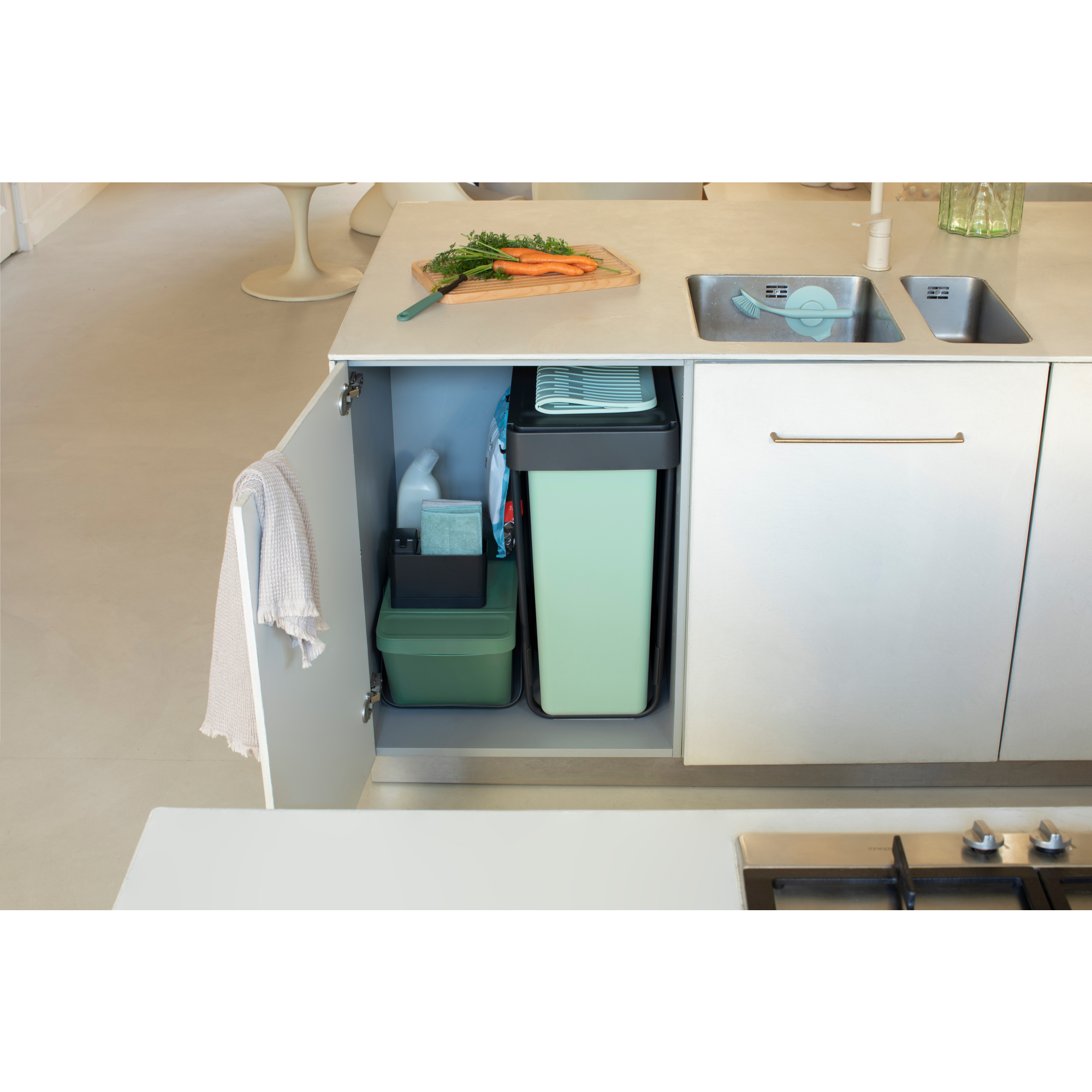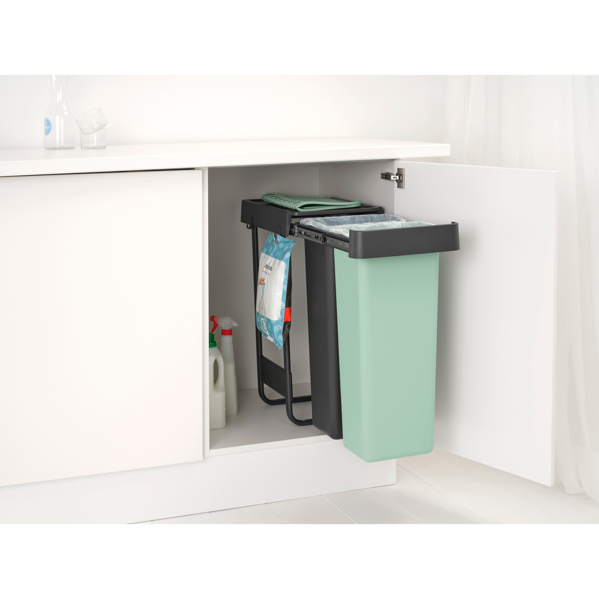 با سطل زباله توکار Brabantia Sort & Go، ۲ در ۳۰ لیتر، قدرت تفکیک زباله خود را بدون از دست دادن هیچ فضایی دو برابر کنید. این سطلها طوری ساخته شدهاند که در کابینت پنهان شوند و دارای قاب نصب آسان (خودایستا هستند، بنابراین درها شل نمیشوند!). این سطلهای کوچک در اکثر کابینتهای آشپزخانه، چه درهایی که به چپ یا راست باز میشوند، جا میشوند. آنها حتی دارای فضای ذخیرهسازی در بالا و قلابهایی در کنار برای سازماندهی بیشتر هستند. با یک ریل تلسکوپی بلند، بنابراین میتوانید آنها را به تنهایی بیرون بکشید. و البته تمیز کردن، بیرون آوردن و خالی کردن آنها نیز آسان است. یک مجموعه عالی.