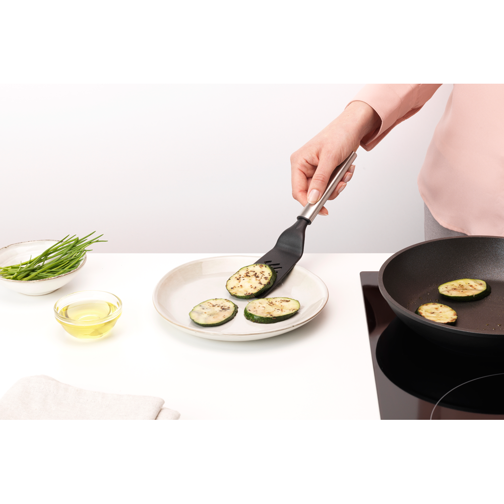 آیا می خواهید همبرگر را برگردانید یا سبزیجات را در داخل تابه پخش کنید؟ از این کفگیر تخت کوچک نچسب پروفایل برابانتیا استفاده کنید. این کفگیر دارای شکاف های هوشمندی است که چربی ها به راحتی بر روی آن از بین می روند و در نتیجه برای سرو عالی می باشد. و از نایلون مقاوم ساخته شده است، بنابراین برای ظروف آشپزی شما مناسب است.